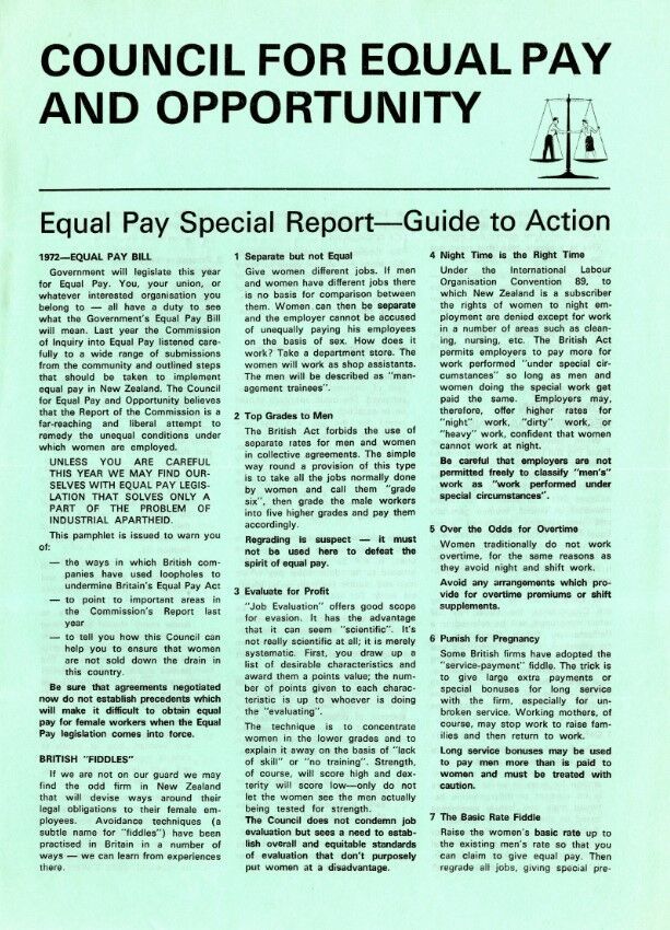 The CEPO was established in 1957 by a coalition of unions and women's organisations including: the National Council of Women; Federation of Business and Professional Women's Clubs; Federation of University Women; Young Women's Christian Association; and Public Service Association. It campaigned for women to receive equal pay in both the government and private sectors. The Equal Pay Act was passed in 1972, with equal pay to be introduced in stages, so that by 1 April 1978 there would be one rate of pay for all workers employed in any given job. In 1977, the passing of the Human Rights Commission Act outlawed discrimination in employment on the grounds of sex. Soon afterwards, the district committees of the CEPO disbanded, and the parent council went into recess.