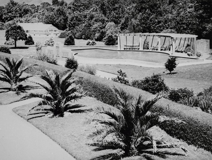 Another view of the paddling pool donated to the children of Palmerston North in 1937 by the Returned Servicemen’s Association. The Begonia Hothouse can be seen to the left of the paddling pool.
