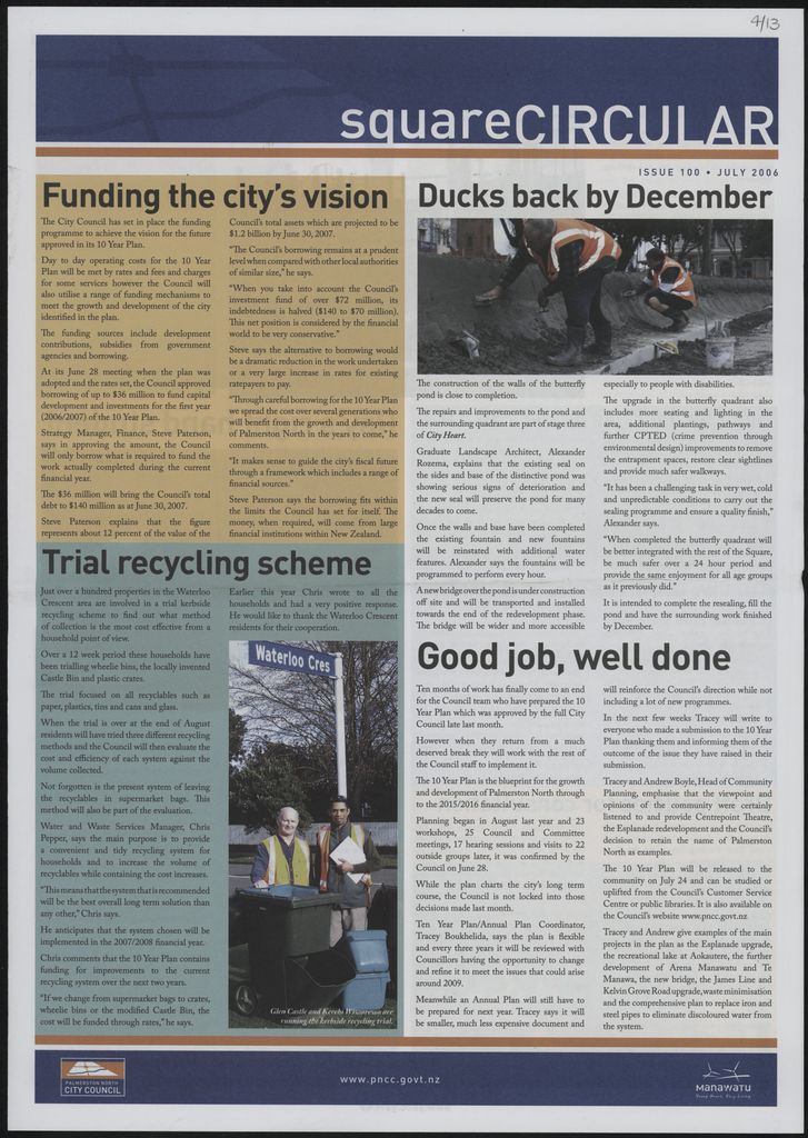 The Square Circular was Palmerston North City Council's monthly community publication, informing Palmerstonians of PNCC initiatives, activites, and events. This month's issue includes: funding programme; 10 year plan; recycling; butterfly pond; Parnell Heights playground; voting change; gas heater safety; policies for consultation; Craig centre, Freyberg High School; The Regent; Methodist Social Service Centre; public toilets; Contact Centre; tattooing and skin piercing bylaws; squash championships; Dittmer Drive road safety.