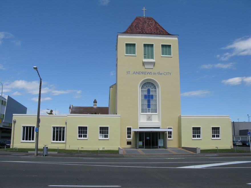 This St Andrew's Church building, the third Presbyterian church on this site, was designed by Gray Young, Morton and Calder, and was opened 28 September 1957. Presbyterian services began in Palmerston North in 1872, and the first church was built in 1878. A second larger building served as the church from 1893 until this one was built.