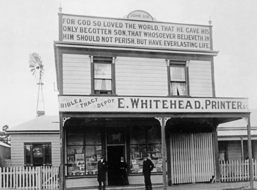 Edward Whitehead, a Feilding farmer, established the 'Bible and Tract Depot' in Main Street, Palmerston North in 1900, so he could expand his business of printing Christian and leaflets and handbills. The windmill to the left drove the large press used for printing. The business was sold in 1949 to James G Harvey who continued it as the Gospel Publishing House, until new premises were built in King Street in 1961.