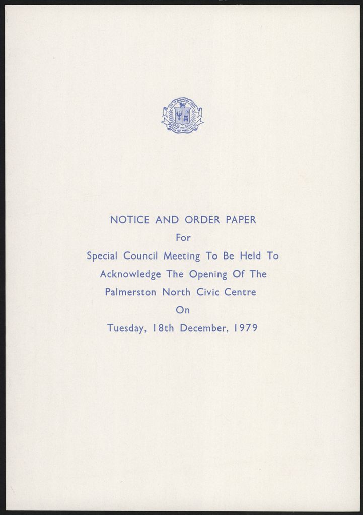 Notice and Order Paper for Special Council Meeting to be Held to Acknowledge the Opening of the Palmerston North Civic Centre. The Palmerston North Civic Centre was opened by Mayor Elwood at the first meeting of the Council in the new Council Chamber of 18 December 1979.