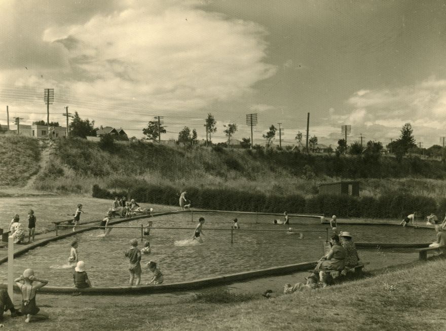 Originally a metal pit for New Zealand Railways, this land was purchased by the City Council in 1940 for a park. The eastern end was developed into a cycle track, sports arena and skating rink between 1951 – 1954. In 1954 the park was renamed Memorial Park when a memorial dedicated to those who died in the two World Wars, was unveiled. By 1975 the parks facilities included a cycling rack, skating rink, children’s swimming pool and a play area in a garden setting.