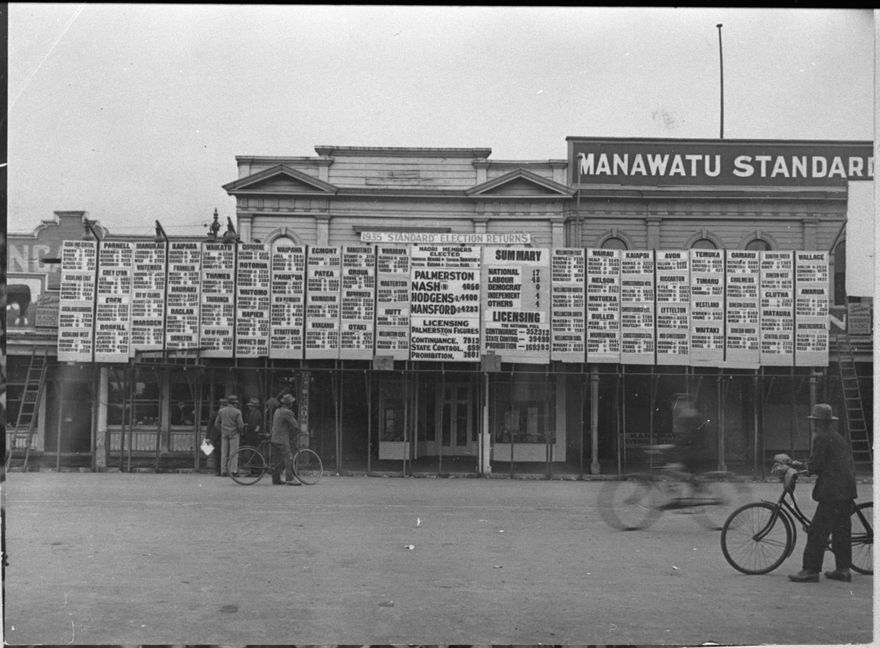 The election result board posted at the Evening Standard office is seen here the day after the 1935 election. This method was common for informing the public of the election results on the night, before the radio became more prominent in New Zealand homes.