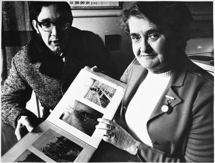 Mrs Moira Ellen Lawson Cruickshank, eldest grand-daughter of Samuel Jickell, shows his photograph album which she lent to the Palmerston North Public Library for copying. Samuel Jickell was Palmerston North's first qualified engineer and Borough Engineer 1904 - 1919. Ian Matheson, Records officer at Palmerston North City Council, later became the city's Archivist.