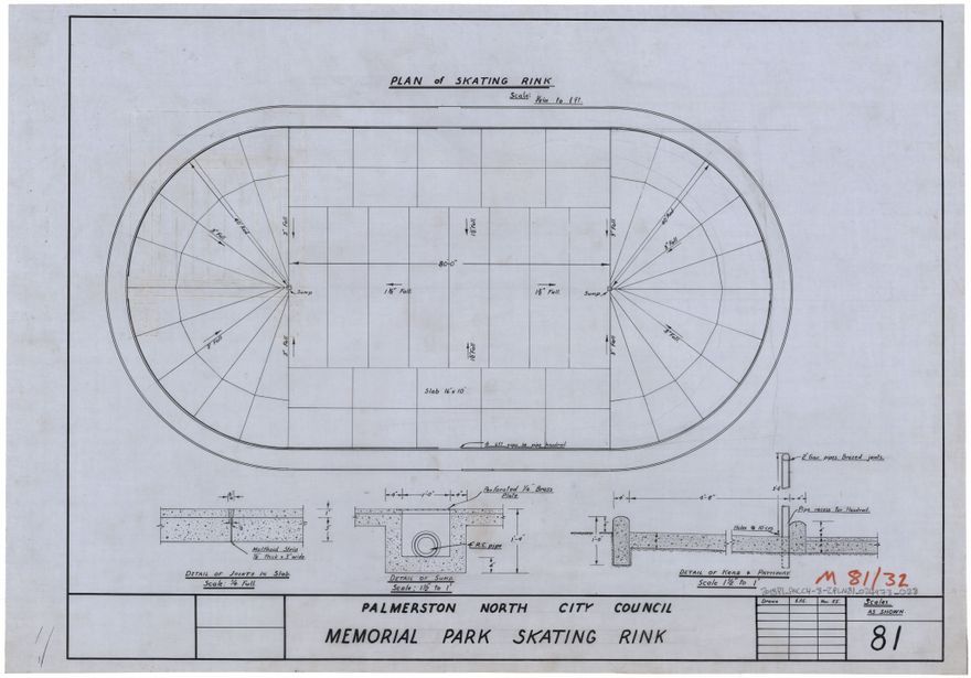 The Palmerston North City Council purchased the site of the old railway ballast pit in 1938 and developed it into a recreational and sporting area. A memorial to citizens killed in World War Two (WWII) was erected and in 1954 Fitzroy Park was officially dedicated as Memorial Park. These plans are not all of the same date but informed the development of the time. The plans cover the general layout, war memorial, running and cycle track, skating rink, clubrooms, dressing shed, toilets, seating, stormwater and cross sections. They also include the proposed plan of the skating rink at Himitangi, and plans for the Cooks Gardens and Western Springs stadium tracks.