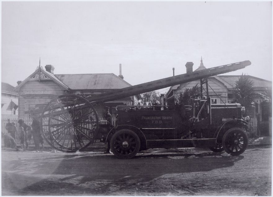 The Palmerston North Volunteer Fire Brigade was formed in 1887. This photograph shows an early fire truck with "Palmerston North F.B.B" printed on the side.