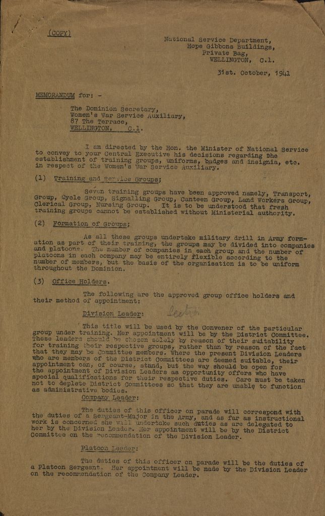 Memo regarding the establishment of training groups, uniforms, badges and insignia, etc. in respect of the Women’s War Service Auxiliary, dated 31 October 1941.