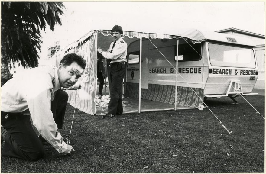 The caravan was presented to the Palmerston North Search and Rescue Advisory Committee bu the Palmerston North Jaycees in 1978. The awning was presented by the Woodville Jaycees in October 1979. In the photograph was Sergeant Ian Sutherland (Left) and Constable Bob Schollum, of the local search and rescue squad.