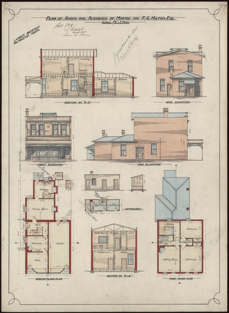 This plan for a two-storey, brick building combining two shops, domestic quarters and outbuildings was designed by L. G. West. The premises, built for F. G. Hilton, were the first brick shops constuctred in Marton. The Wanganui Chronicle reported: "They stand on one of the best sites in town, and on a section running from Broadway to Stewart Street, and present a most city-like appearance. They have a frontage of 33 feet to Broadway, with windows of the best plate glass the back ground being of mirror plate. The shop on the left is to be occupied by the enterprising owner of the building (Mr F. G. Hilton), watch-maker, and that on the right by Mr A. K. McGregor, the well-known saddler. Attached to Mr Hilton's shop is a commodious dwelling of seven rooms ... Mr Hilton is pleased with the way Messrs Zajouskowski Bros. and their foreman bricklayer (Mr Hardman) have executed the work, as also with Mr J. G. Campbell, the painter and decorator. The shop was opened on Saturday evening with by far the largest display ever shown in the town, and the place was visited by a very large number of townfolk. The proprietor is to be congratulated on his enterprise and confidence in the town in which he lives." (22 December 1902).