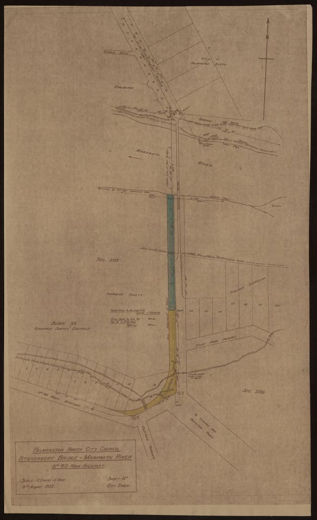 These engineering plans show the location and structure of the second Fitzherbert Bridge. Since the 1870s, the vehicle across the Manawatū River has been a vital piece of infrastructure, helping to connect Palmerston North with the surrounding argicultural hinterland. During the 1920s the deterioration of the original timber structure and an increase in motor traffic led to calls for a new bridge. In 1929 the Government Main Highways Board offered to pay two thirds of the cost, with the Palmerston North Borough Council and the Kairanga County Council jointly funding the remaining third. Plans and specifications were prepared by the Municipalities Engineering staff under the supervision of John R. Hughes, the City Engineer. The contract was awarded to Fletcher Construction Company Ltd., which constructed the bridge between 1933 and 1935. The new concrete bridge was 256 meters in length with a 6.7 meters wide carriageway and 1.5 meters wide footpath. The structure’s most distinctive feature were the four pairs of bowstring arches, each 34.1 meters wide and 9.2 meters high. The total cost of construction was £34,074. It was demolished in 1987, following the construction of the current Fitzherbert Bridge.