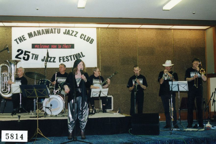 The Valley Stompers performing at the 25th Annual Manawatū Jazz Festival. L-R: Roger Metcalf (tuba) Bill East (drums) Unidentified (vocals) Randall Gibson (leader/banjo) Ray Heath (clarinet) Gordon Blishen (trumpet) Alan Roy (trombone)