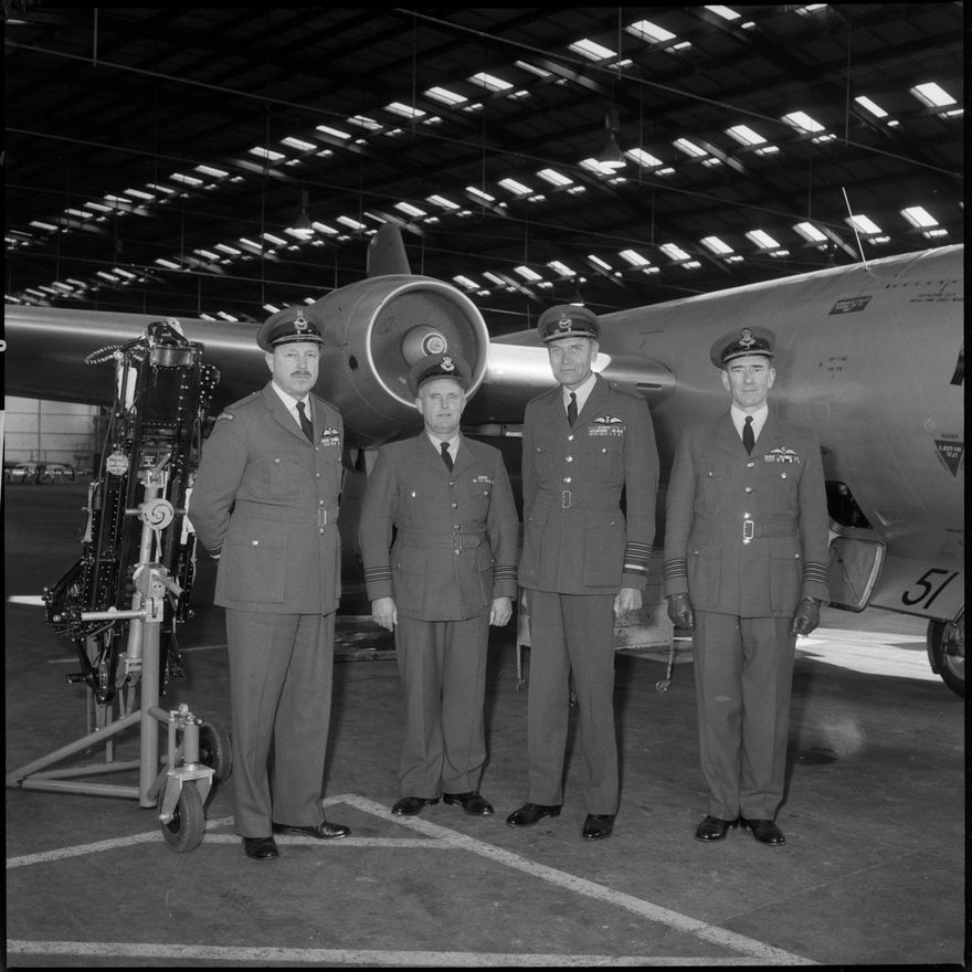 This image was taken for a story that ran in The Manawatu Evening Standard on 17 June, 1963. "Inspecting the R.N.Z.A.F. Station at Ohakea today was New Zealand-born Air Chief Marshal Sir Charles Elworthy (third from left), the Chief Air Staff-designate. With Sir Charles (from the left) are Air Vice Marshal I. G. Morrison, Wing Commander C. J. Horsley and the commanding officer at Ohakea (Group Captain K. W. Trigance)."