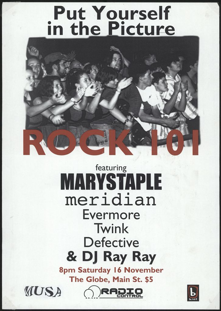 Put yourself in the picture. Rock 101. Featuring Marystaple, Meridian, Evermore, Twink; Defective & DJ Ray Ray. 8pm Saturday 16 November. The Globe, Main Street. $5. MUSA. Radio Control. Part of a collection of posters that were displayed at The Stomach, Lombard Street, venue for Creative Sounds Society Incorporated.