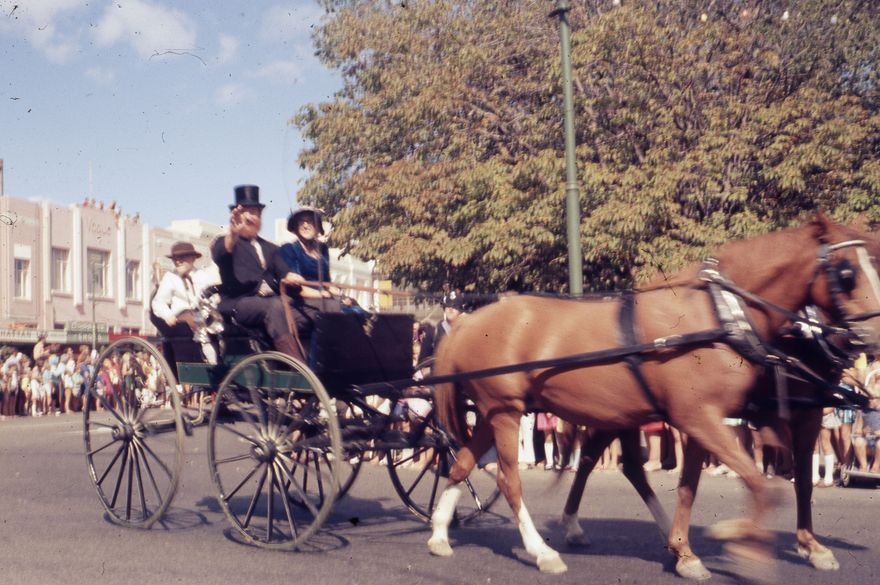 A horse and cart in the Centennial Parade. 92 floats took part at the Palmerston North City Centennial celebrations of 1971. Approx. 10,000 people were present at the event to celebrate 100 years of Palmerston North.