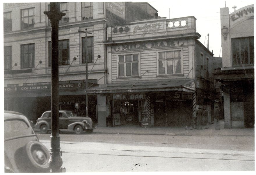 The Golden Gate Milk Bar was situated at 78 Courtenay Place, Wellington, opposite the St James Theatre. The Reading Centre has now been built on the site, and the Milk Bar was situated to the east of the Reading Centre. It was owned and operated by Peter Bares 1935-1942. Peter Bares was born in Greece and emigrated to New Zealand in 1930. In 1945 he moved to Palmerston North when he bought the Royale Dutch luncheon and tearooms. Further information can be found on the Bares family and businesses at IMCA A175/381-R.
