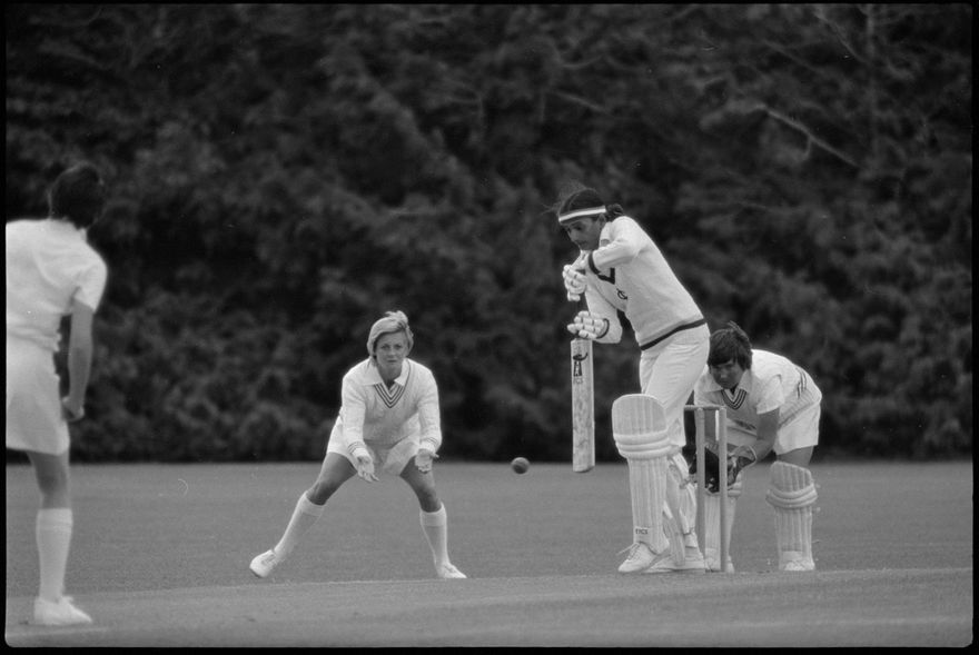 Captain Shantha Rangaswamy defends during her innings of 5 in a half hour stay at the crease. A disappointing score for Shantha, whose storied career ran from 1976 to 1991. She was the first Indian women's cricket captain, the first to win a test match and the first to receive a lifetime achievement award from the BCCI (Board of Control for Cricket in India).