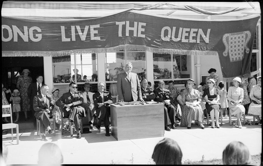 This image was taken for a story that ran in The Manawatu Evening Standard on 24 November 1958: "The Minister of Education (Mr. Skoglund) officially opened the new Awapuni School on Saturday afternoon. The official party (from left) are: Mr. A.G.E. Stirling, headmaster; Mr. K. McArtney, the secretary of the Wanganui Education Board; Mr. W.B. Tennant, M.P., Mayor of Palmerston North; Mr. Skoglund (standing); Mr. H. Watford, the chairman of the Awapuni School Committee ; Mr. W.H. Brown, the chairman of the Education Board; and Mrs. Tennant and Mrs. Brown."