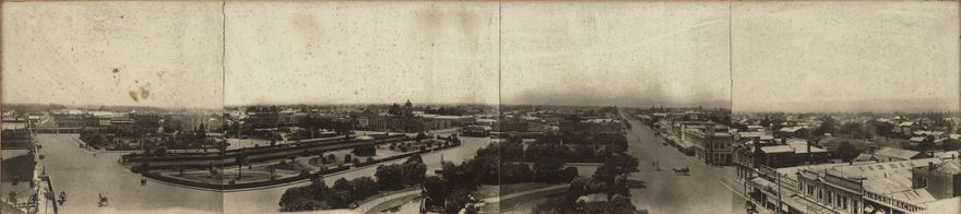 The panorama was taken in four sections, probably from the Grand Hotel. The first section looks towards Coleman Place around to Rangitikei Street. The second section shows the central quadrant of The Square with the band rotunda and the railway line running through it. The third section, looking from the Grand Hotel corner, through The Square and down Church Street, shows the Fitzherbert Avenue corner. The fourth section overlooks rooftops towards Fitzherbert Avenue and beyond.