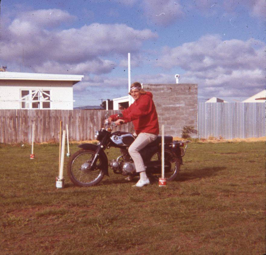 Student K. Rankin. As part of the road safety course, students are required to master handling of their motorcycles, including emergency stops, handling obstacle courses, and as shown here, slaloming between poles in the field beside the school.