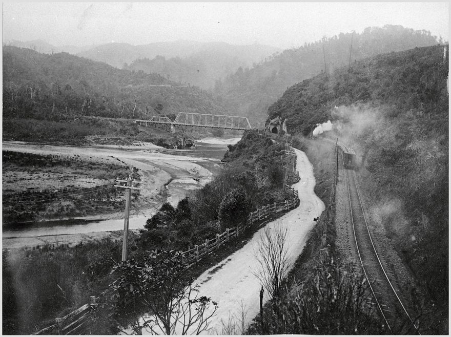 In the centre can be seen the Ballance Bridge,over the Manawatu River, opened in 1904 and since replaced. On the right of the road leading into the Gorge is the Palmerston North to Napier railway line that opened in 1891. The tunnels seen were daylighted (removed) in 2008 to allow for larger freight cars.