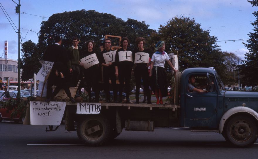 Signs on this float read "Extra-mural study benefits the country" and "Mr Fly-burg nourishes the waif". Peter Freyberg was the first director of Extramural Studies at Massey University. Although controversial, studying off campus became an important tool in recruiting more student teachers post baby boom.