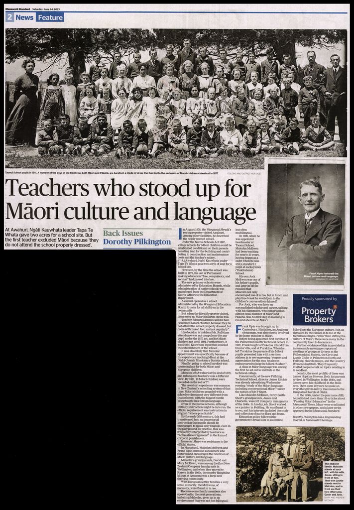 - Local historians weekly "Back Issues" article in the Manawatū Standard. The teaching and learning of te reo and te ao Māori in schools from late 19th century to early 20th century.