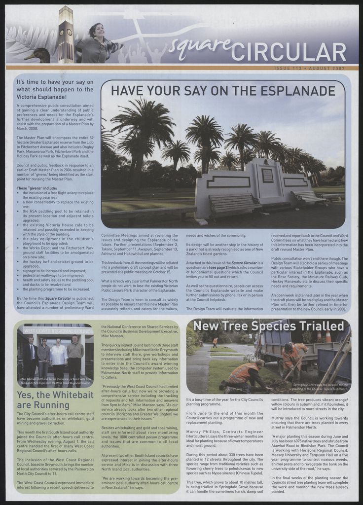 The Square Circular was Palmerston North City Council's monthly community publication, informing Palmerstonians of PNCC initiatives, activites, and events. This month's issue includes: Building inspection accreditation, call centre, customer services centre, cycling, election, events, Galley Reserve, Milson Line, James Line, library, Square Edge, tree planting, Victoria Esplanade, winter festival