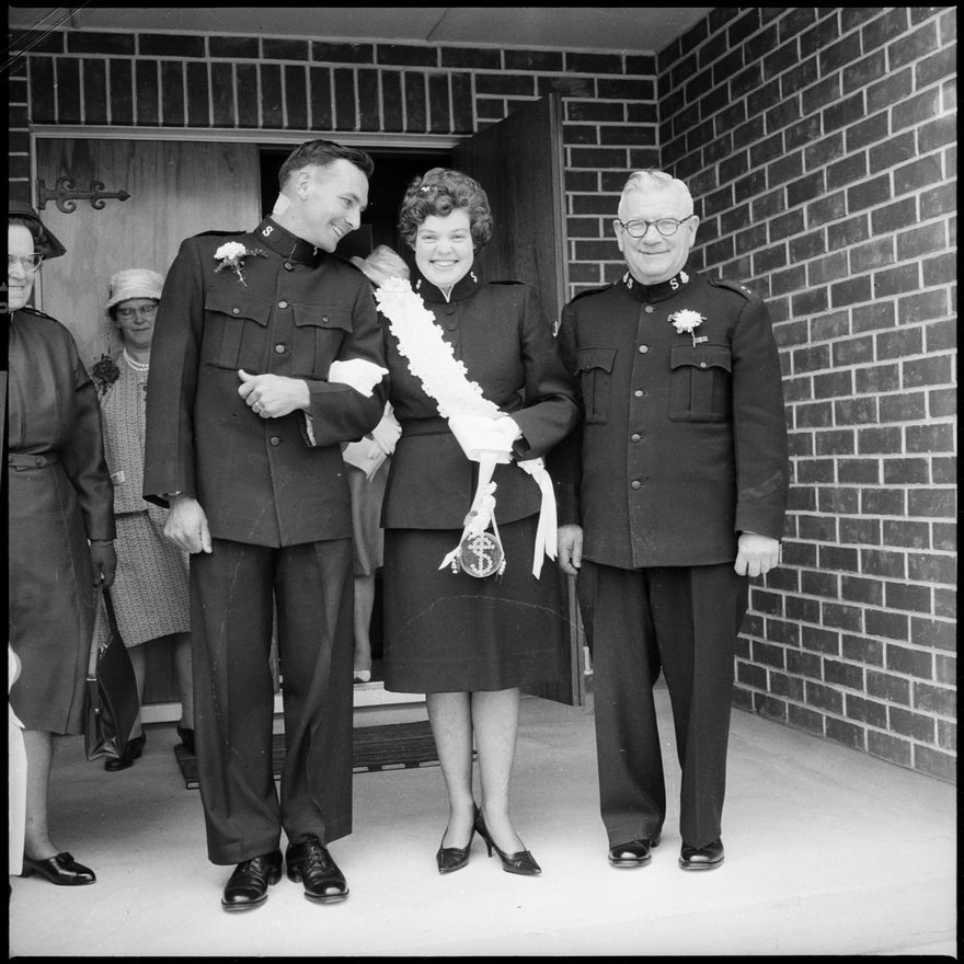 This image was taken for a story that ran in The Manawatu Evening Standard on 6 January, 1964. "Brigadier L. H. Jones, of the Salvation Army, was a happy father on Saturday. Not only did he lead his daughter to the altar, but he also conducted the wedding ceremony at the Terrace End Citadel that morning. The bride presented an attractive picture in her uniform with white lace wedding band. From the left are the bridegroom (Mr A. G. Davis), the bride, formerly Miss R. A. Jones, and Brigadier L. H. Jones." See also: 2017N_2017-20_018274, 2017N_2017-20_018275