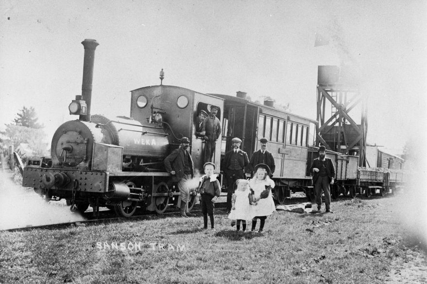The tram, "Weka", at Sanson. George Hickford, the County Engineer, is on the right.