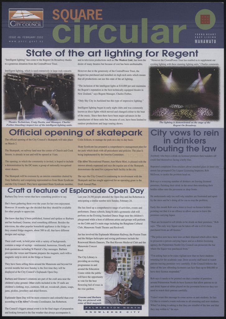 The Square Circular was Palmerston North City Council's monthly community publication, informing Palmerstonians of PNCC initiatives, activites, and events. This month's issue includes: Regent theatre; Friends of the Regent; Globe theatre; skatepark opening; Esplanade open day; liquor licensing; water management; waste management; Ray Swadel; Brian Trott; Ian Reid; mature employment support agency; draft annual plan; parking; Town Crier; garage sale in The Square; Manawatu Jazz Club; Festival of cultures; Destination Manawatu.