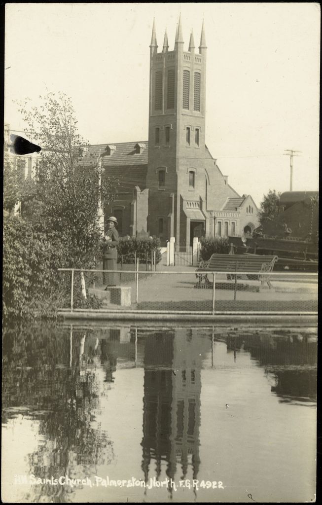 Looking across the lakelet in The Square to the newly constructed All Saints Church. This All Saints Church was built in 1914 on the site of two previous Anglican churches. The first church was built in 1875, and was replaced by a larger building, incorporating the original church, in 1882. In 1910 the second church was moved back on the site to make way for the present brick church, designed by C T Natusch and Sons.