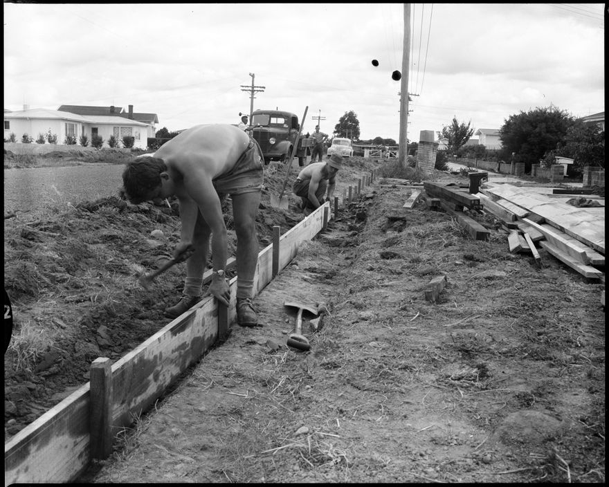 This image was taken for a story that ran in The Manawatu Evening Standard on 29 November 1960 "Contractors are carrying out the construction of kerbing and channelling and a footpath in lower Jickell Street at present. The contractors for this project are two university students whose [sic] are in Palmerston North. Nearest the camera is Mr. John Panting and further away is Mr. P.J. Evans."