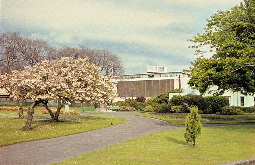 Looking across The Square and past the Ladies Rest Rooms, then painted green, to the Palmerston North Public Library on the corner of Main Street and The Square. This building served as the library 1965 - 1996