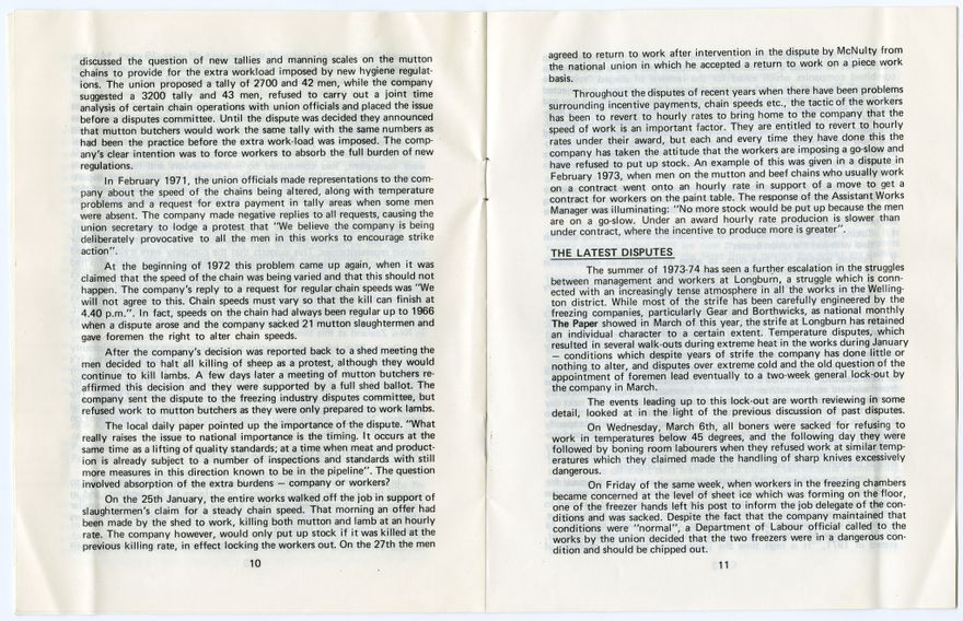 This booklet outlines industrial disputes at the Longburn freezing works during the 1970s, specifically: disputes over operating temperatures at extremes of both heat and cold; disagreements between workers and management over the roles of foremen and leading hands; pay disputes; and general working conditions and workloads.