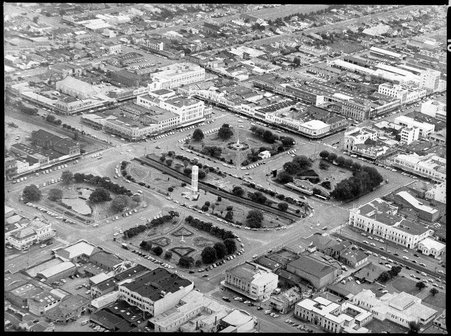 At top right is Rangitikei Street, on the corner of The Square. Through the centre of The Square can be seen the railway line, which ran down Main Street, on both sides of The Square, until it closed in 1964. The slight bend in the rail line in The Square, as seen, was paid for by the Palmerston North Borough Council to accommodate the war memorial in the centre (indistinct), when it built in 1926. The Hopwood clock tower, erected 1957, can be seen without its permanent cross (not added until 1981). Distinctly can be seen the four quadrants and the centre strip, divided by the roads which ran into The Square for a long period of time. Today (2014) The Square has returned to its original one block of land.