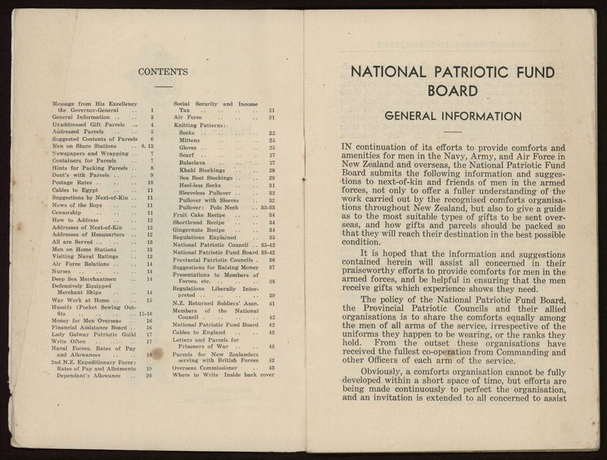 Book issued by the National Patriotic Fund Board outlining details of acceptable gifts for those serving overseas in World War II, and how to despatch the goods to them.