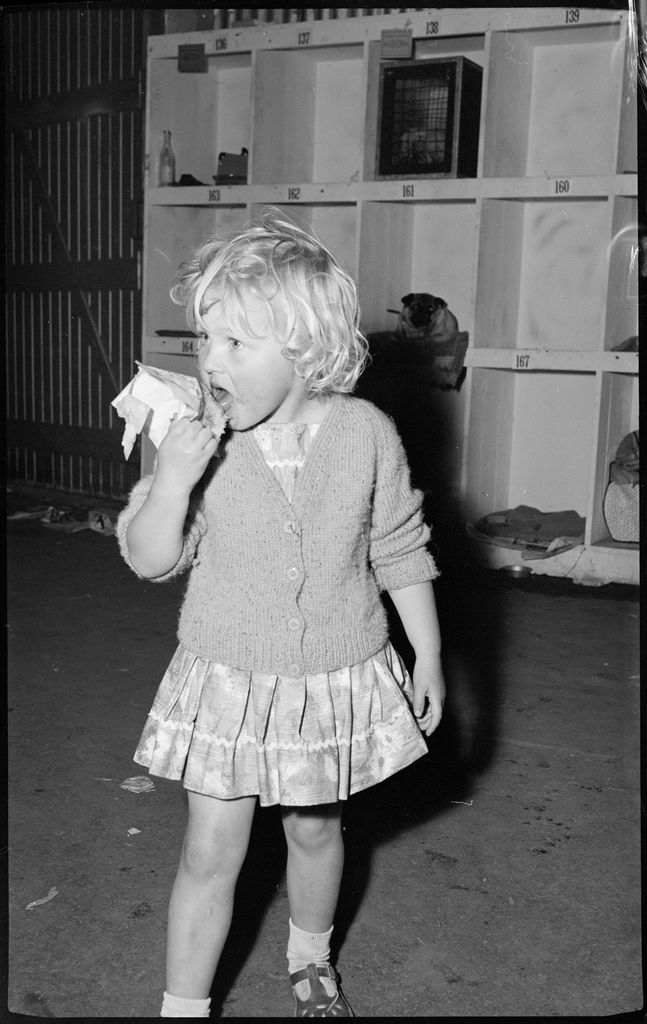 This image was not published in The Manawatu Evening Standard, taken on date unknown. “Unidentified Young Girl Enjoying Something to Eat, animals pictured in the background of the photo.”