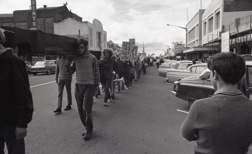 "More than 200 anti-Vietnam war demonstrators marched quietly and solemnly along Broadway Avenue in Palmerston North shortly after noon yesterday, carrying a dozen black-draped coffins designed to symbolise the 28 New Zealanders killed in the Vietnam War.
