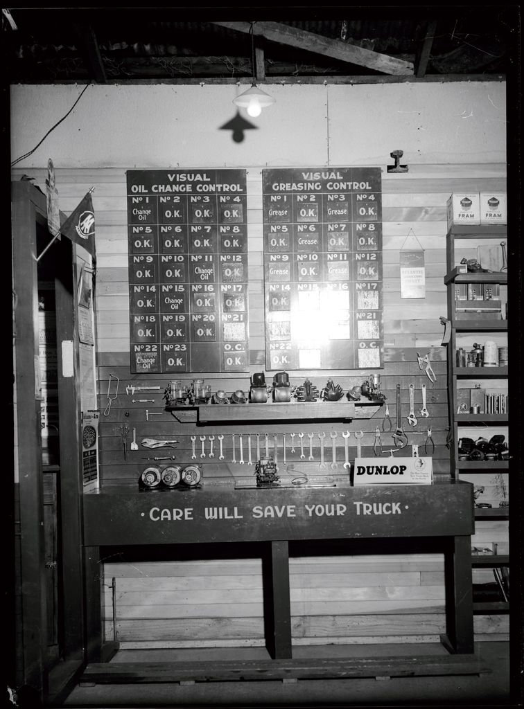 A corner of Child Bros workshop. Spanners and charts for the use of mechanics can be readily identified in this photograph.