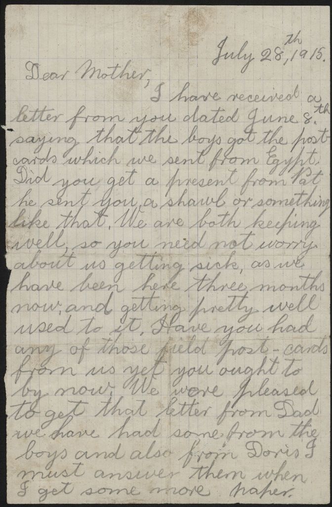 Len Argyle (1894-1915) was one of the sons of Henry and Alice Argyle of Bunnythorpe. He and his brother Pat (Percival) enlisted in the NZ Expeditionary Forces together and served in World War One. This letter from Len to his parents, is presumed to be from Gallipoli.