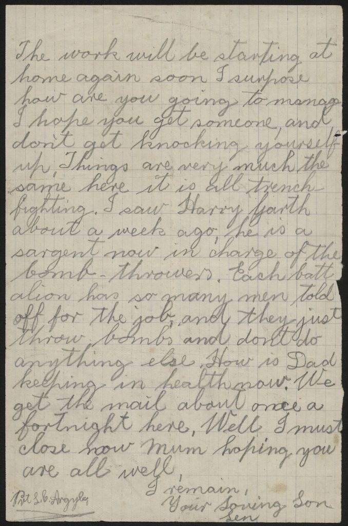 Len Argyle (1894-1915) was one of the sons of Henry and Alice Argyle of Bunnythorpe. He and his brother Pat (Percival) enlisted in the NZ Expeditionary Forces together and served in World War One. This letter from Len to his parents, is presumed to be from Gallipoli.