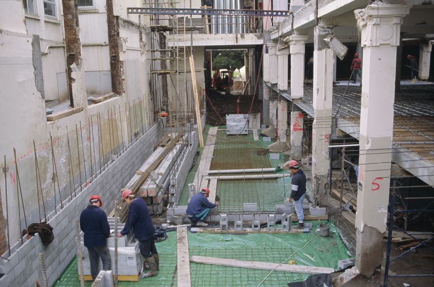 Workmen constructing the entrance ramp to the new Palmerston North City Library, which leads from The Square across to George Street. The new City Library was formerly a department store, originally built for C M Ross Co. Ltd in 1928.