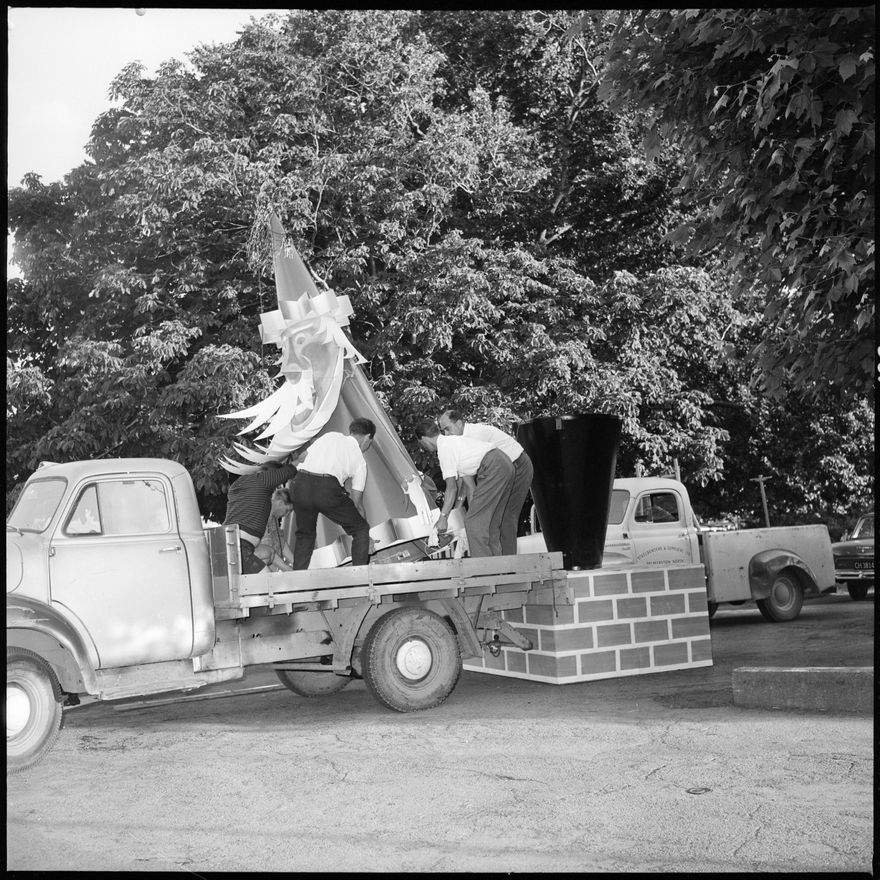 This image was taken (but not used) for a story that ran in The Manawatu Evening Standard on 11th January 1966 "The last trappings of the Christmas season departed from the city yesterday when Father Christmas and the Nativity scene were removed from the Square. the 600lb, 18ft high likeness of Santa Claus, was lifted to a truck late yesterday and taken to Messrs. Hodder and Tolley's for storage until next year. In the picture, members of the P.R.O. are moving Santa Claus on to the truck."
