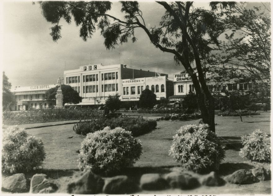 This photographs was created as part of a series of eight photographs showin scenes of Palmerston North. Shown here is the PDC building in The Square, the Premiere Drapery Company was a successful business operating for many years in The Square.