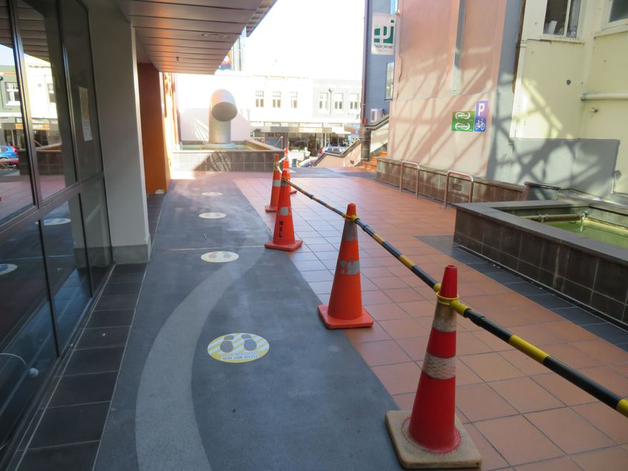 Measures in place to assist with social distancing for those waiting to enter the Palmerston North City Library during the COVID-19 pandemic.