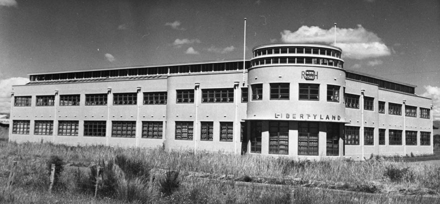 R W H Symington and Co. (N Z) Ltd first established themselves in New Zealand in 1934. Specialising in corsetry and underwear manufacturing, a small factory was built in Palmerston North in 1937, and the main "Libertyland " factory was completed and opened in 1946. The company was acquired by Courtalds Pty (UK) in 1965 and then in 1990 became a wholly owed subsidy of Lane Walker Rudkin (LWR) lndustries Ltd, New Zealand’s largest textile garment company. Libertyland closed to business in July 2009, and was demolished in 2012.