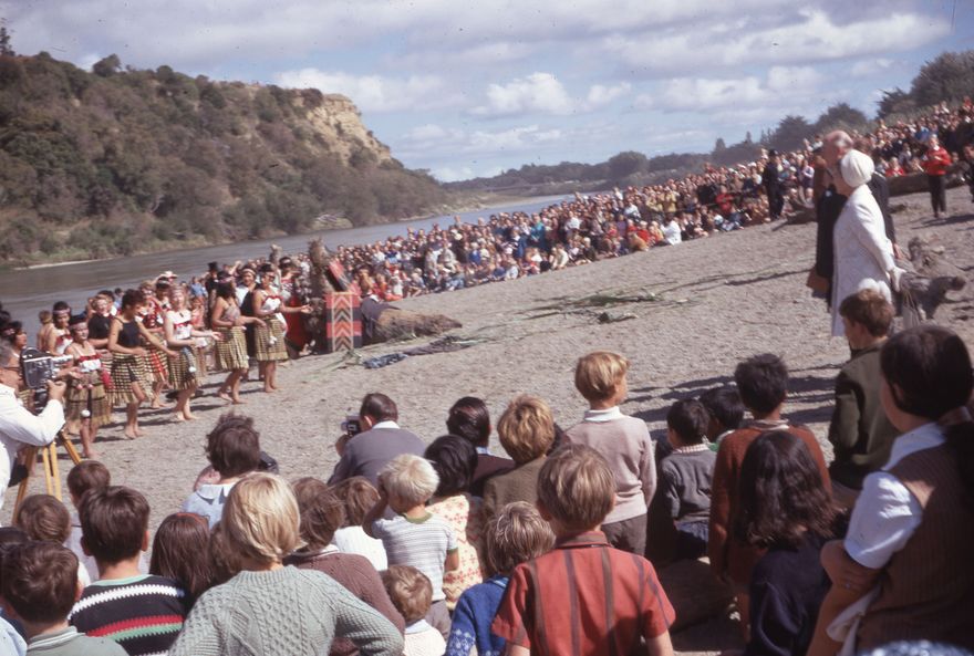 Women in traditional Māori dress perform for the Governor General, Sir Arthur Porritt and Lady Porritt, at the re-enactment of the arrival of settlers at the Manawatu River. Large crowds line the river bank to watch the event.