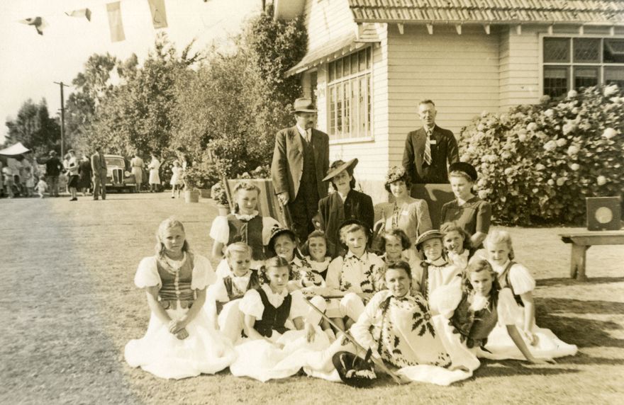 - The SPCA (Society for the Prevention of Cruelty to Animals) garden party to raise funds was held at 'Nettleworth', Ihaka Street, Palmerston North, the home of the President, Mr W Jacques, to which the children from the Polish Children's Camp in Pahiatua were invited. Standing: Headmaster of Polish Children's Camp and Mr William Jacques, President of the SPCA and Chairman of the Polish Children's Camp Board of Guardians. Seated: Miss Mervid, Mrs Ann Jacques and Mrs Tietza. At front: Children from the Polish Children's Camp at Pahiatua who dance their national dances.