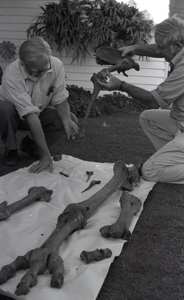 This series of images were taken for a story that ran in The Manawatu Evening Standard on 29 April, 1982. “A well-preserved set of moa bones found on a Levin farm this week will have to be identified by an expert. The bones – a foot and a leg from a large bird and bones from a smaller bird – were found during clearing of a drain 1.5 metres deep on Mr Collis Blake’s farm at Ihakara, north of Levin. R Lou Gurr (left), a former reader in zoology at Massey University, said the large bones definitely came from the “big moa” but the species still had to be identified. He said the bird could have been as tall as 3.5 metres. Mr Blake’s grandfather found a similar set of bones in 1916 in Wairarapa.”